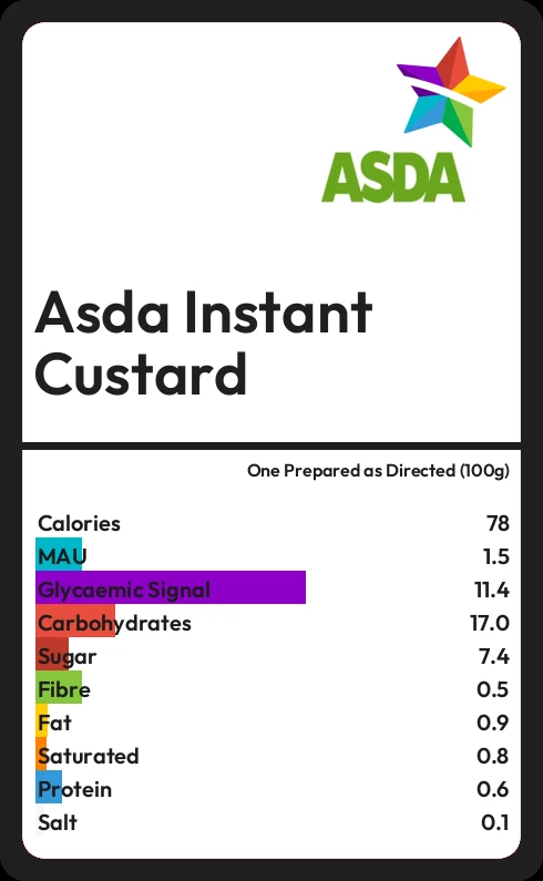 Asda Instant Custard contains 78 calories in one Prepared as Directed (100g).