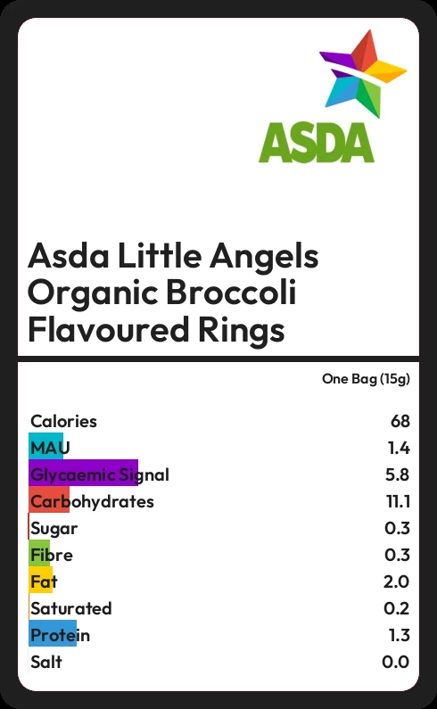 Asda Little Angels Organic Broccoli Flavoured Rings contains 0.3g sugar in one Bag (15g)