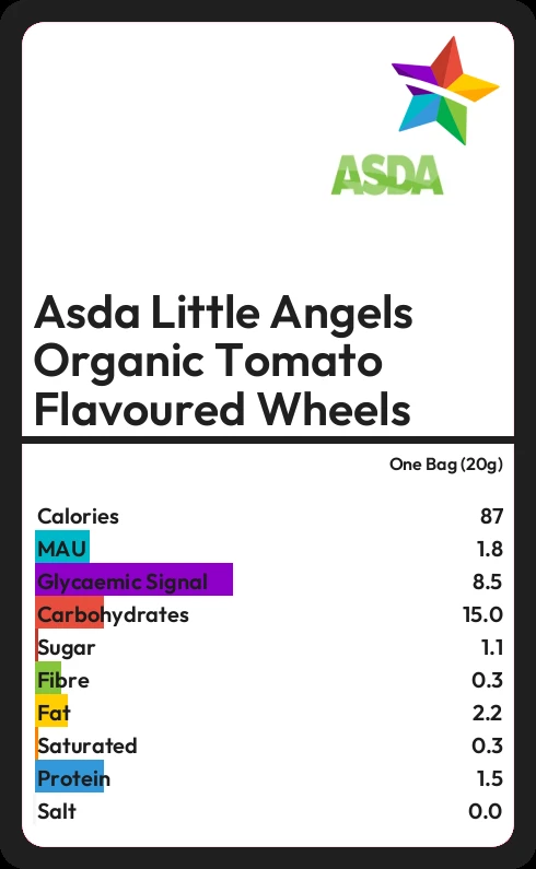 Asda Little Angels Organic Tomato Flavoured Wheels contains 1.1g sugar in one Bag (20g)
