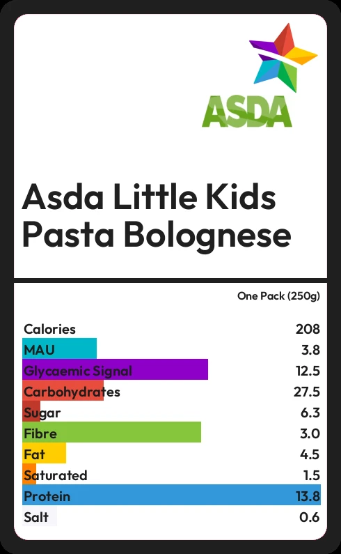 Asda Little Kids Pasta Bolognese contains 207.5 calories in one Pack (250g).