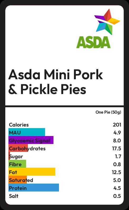 Asda Mini Pork & Pickle Pies contains 1.7g sugar in one Pie (50g)