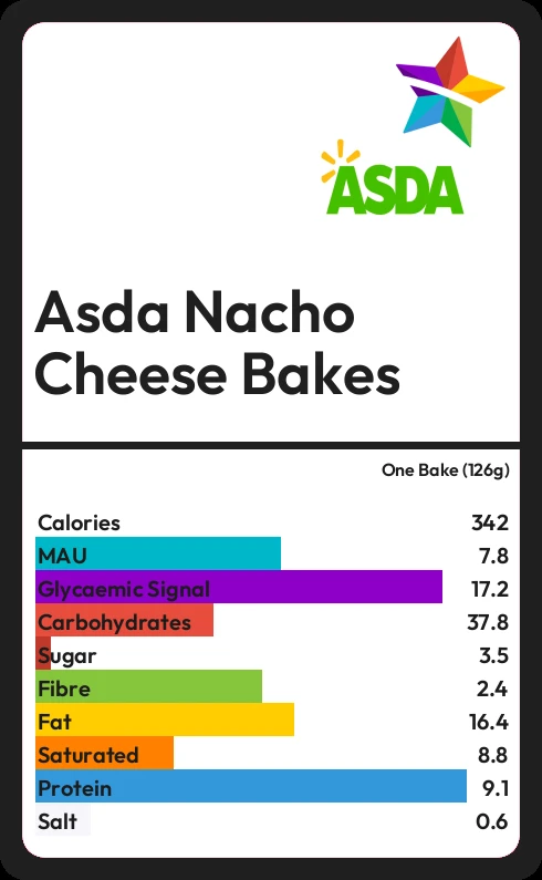 Asda Nacho Cheese Bakes contains 341.5 calories in one Bake (126g).