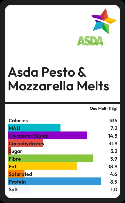 Asda Pesto & Mozzarella Melts contains 335.1 calories in one Melt (118g).
