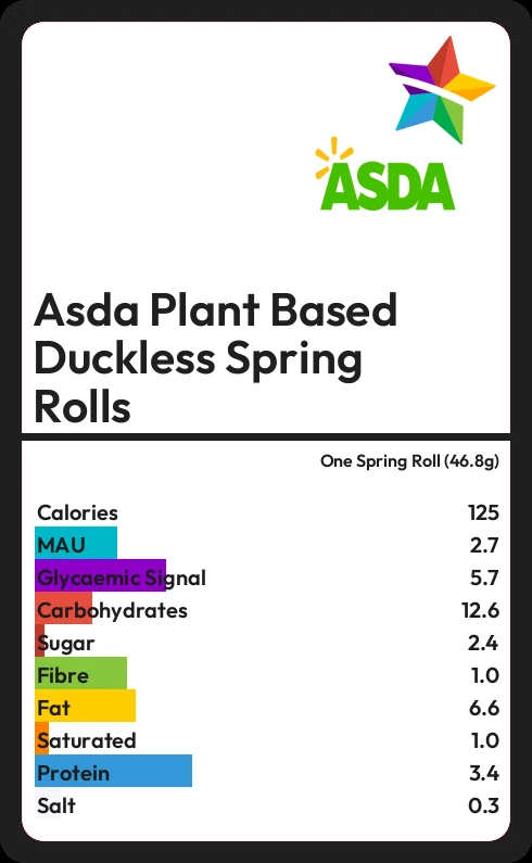 Asda Plant Based Duckless Spring Rolls contains 125 calories in one Spring Roll (46.8g).
