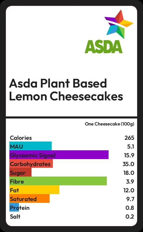 Asda Plant Based Lemon Cheesecakes contains 18.0g sugar in one Cheesecake (100g) - that is around 5 cubes of sugar.