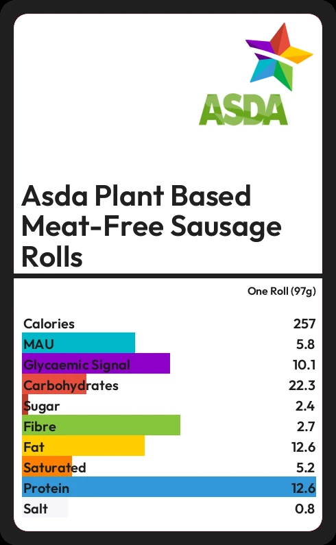 Asda Plant Based Meat-Free Sausage Rolls contains 257.1 calories in one Roll (97g).