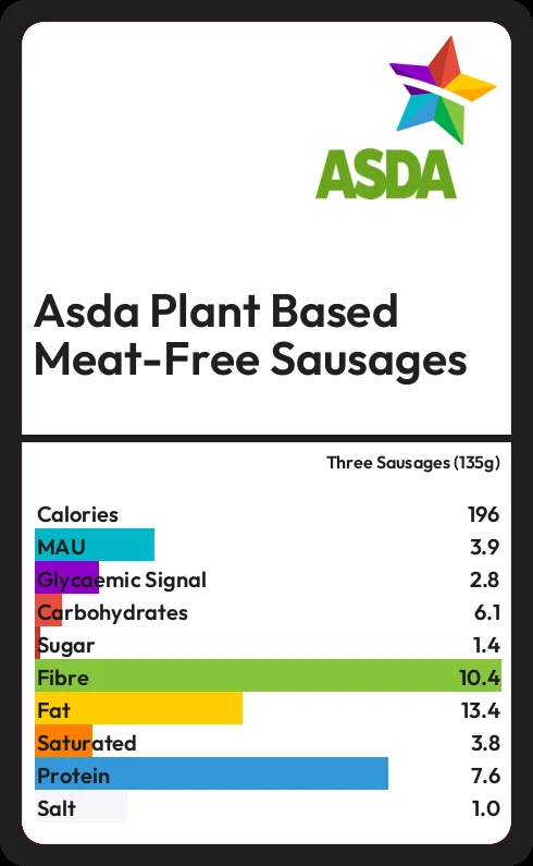 Asda Plant Based Meat-Free Sausages contains 1.4g sugar in three Sausages (135g)