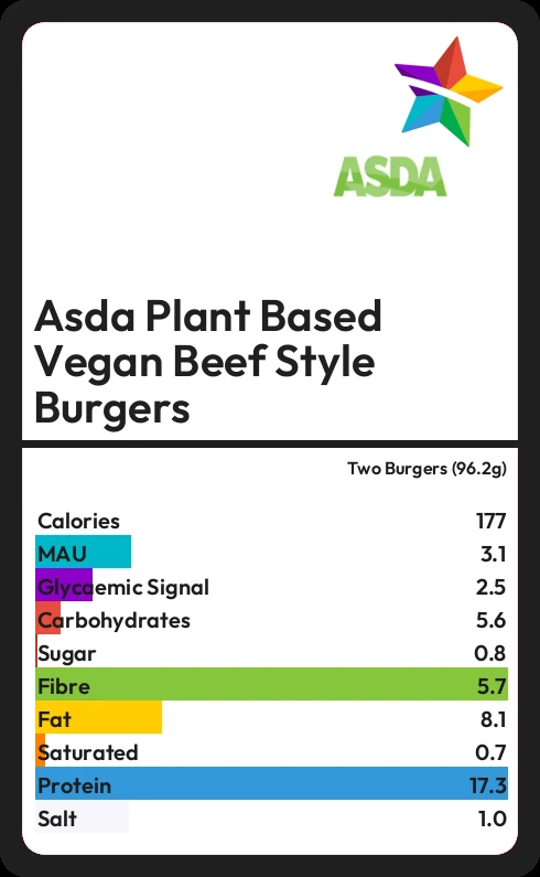 Asda Plant Based Vegan Beef Style Burgers contains 177 calories in two Burgers (96.2g).