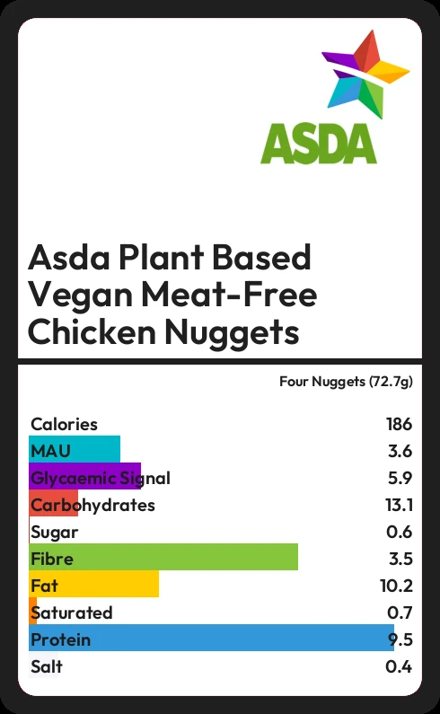Asda Plant Based Vegan Meat-Free Chicken Nuggets contains 0.6g sugar in four Nuggets (72.7g)