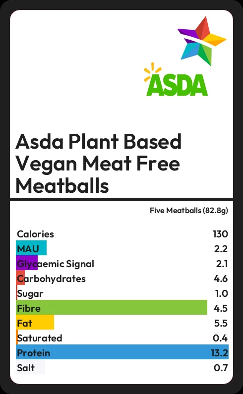 Asda Plant Based Vegan Meat Free Meatballs contains 1.0g sugar in five Meatballs (82.8g)