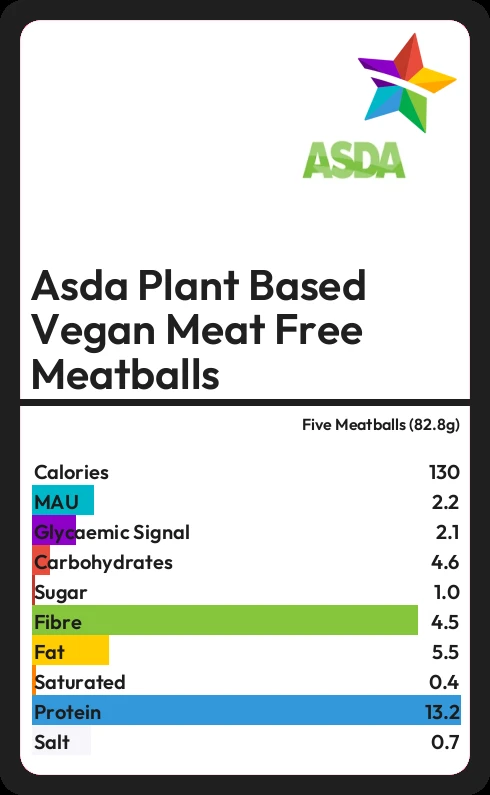 Asda Plant Based Vegan Meat Free Meatballs contains 130 calories in five Meatballs (82.8g).