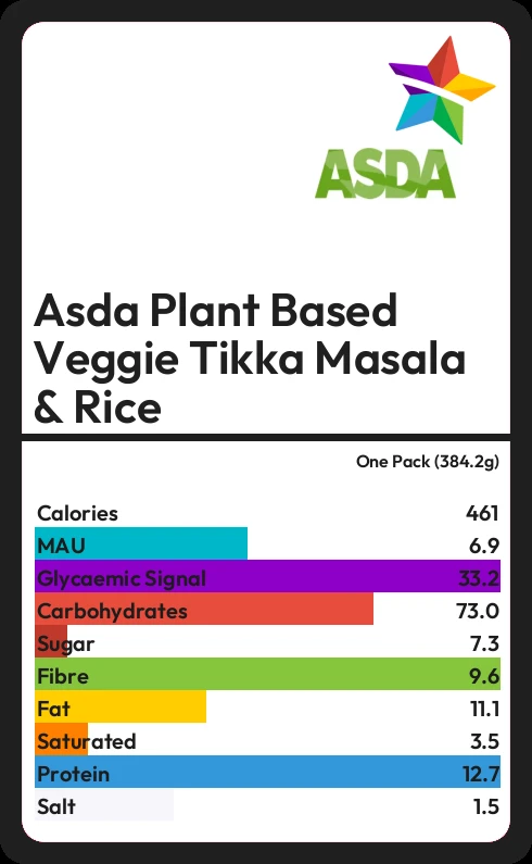 Asda Plant Based Veggie Tikka Masala & Rice contains 461 calories in one Pack (384.2g).