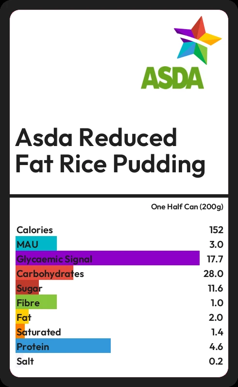 Asda Reduced Fat Rice Pudding contains 152 calories in one Half Can (200g).