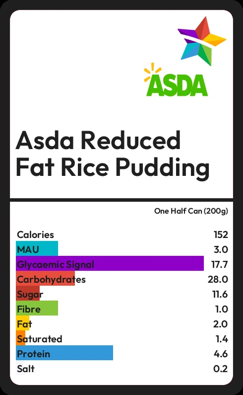 Asda Reduced Fat Rice Pudding contains 152 calories in one Half Can (200g).