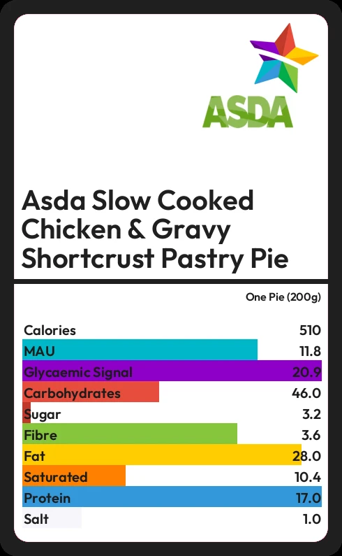 Asda Slow Cooked Chicken & Gravy Shortcrust Pastry Pie contains 510 calories in one Pie (200g).