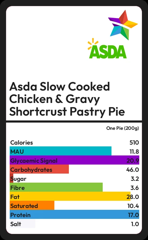 Asda Slow Cooked Chicken & Gravy Shortcrust Pastry Pie contains 510 calories in one Pie (200g).