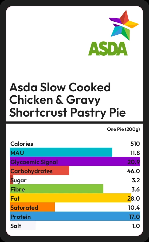 Asda Slow Cooked Chicken & Gravy Shortcrust Pastry Pie contains 510 calories in one Pie (200g).