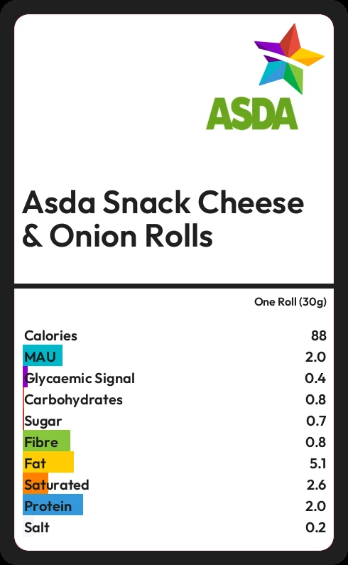 Asda Snack Cheese & Onion Rolls contains 0.7g sugar in one Roll (30g)