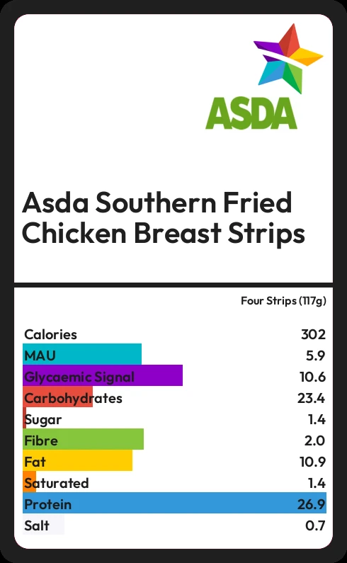 Asda Southern Fried Chicken Breast Strips contains 301.9 calories in four Strips (117g).