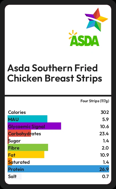 Asda Southern Fried Chicken Breast Strips contains 1.4g sugar in four Strips (117g)
