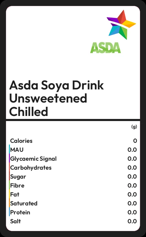 Asda Soya Drink Unsweetened Chilled contains 24 calories in 100g.