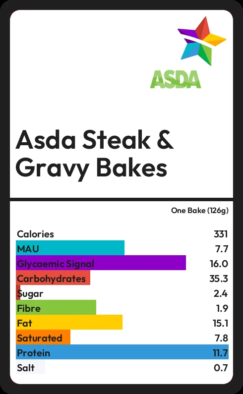 Asda Steak & Gravy Bakes contains 331.4 calories in one Bake (126g).