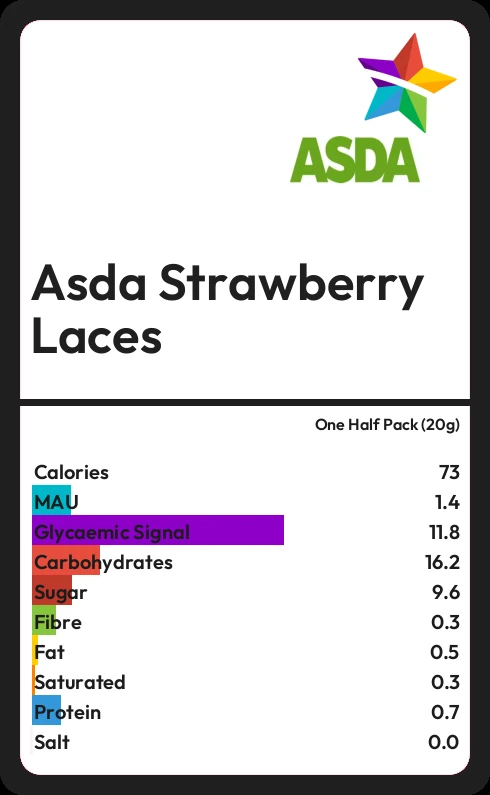 Asda Strawberry Laces contains 72.6 calories in one Half Pack (20g).