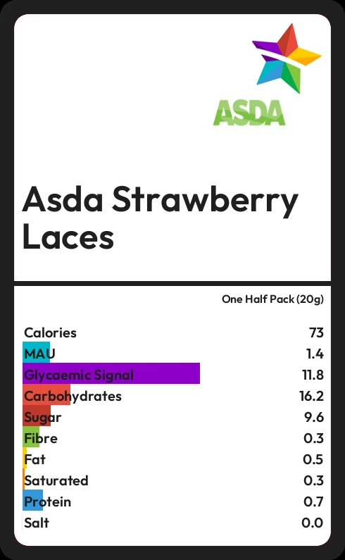 Asda Strawberry Laces contains 72.6 calories in one Half Pack (20g).