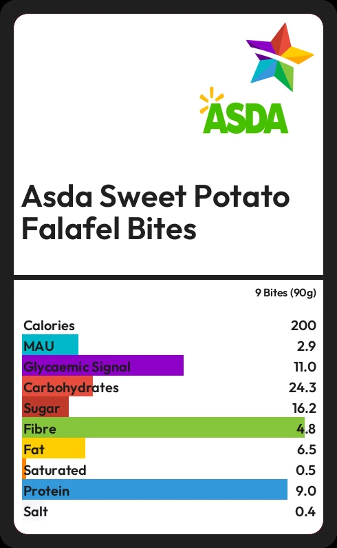Asda Sweet Potato Falafel Bites contains 16.2g sugar in 9 Bites (90g) - that is around 4 cubes of sugar.