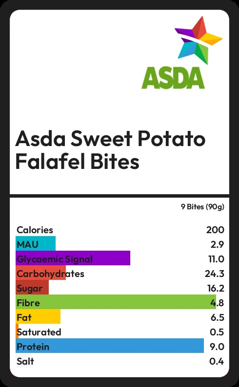 Asda Sweet Potato Falafel Bites contains 16.2g sugar in 9 Bites (90g) - that is around 4 cubes of sugar.
