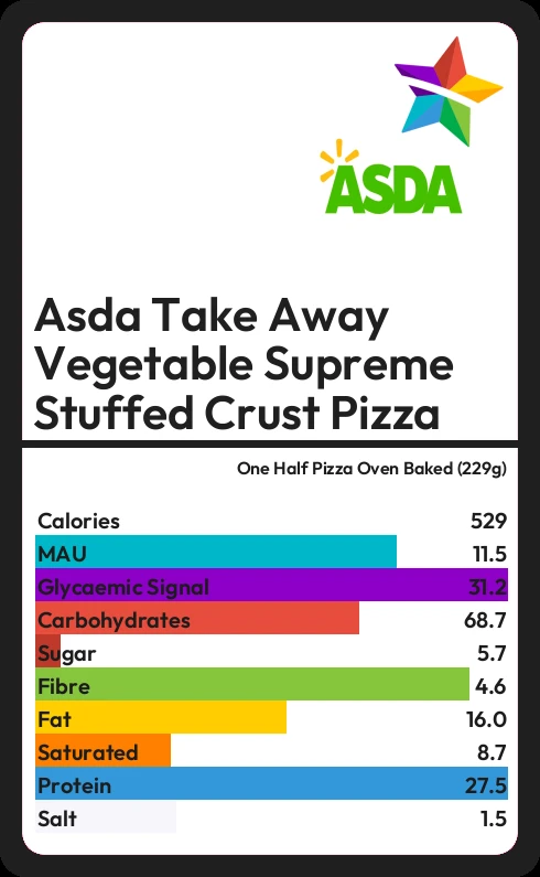 Asda Take Away Vegetable Supreme Stuffed Crust Pizza contains 529 calories in one Half Pizza Oven Baked (229g).