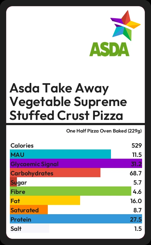 Asda Take Away Vegetable Supreme Stuffed Crust Pizza contains 529 calories in one Half Pizza Oven Baked (229g).
