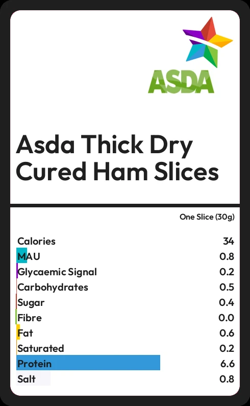 Asda Thick Dry Cured Ham Slices contains 34.2 calories in one Slice (30g).