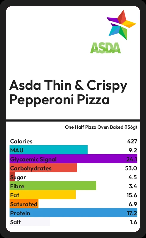Asda Thin & Crispy Pepperoni Pizza contains 427.4 calories in one Half Pizza Oven Baked (156g).