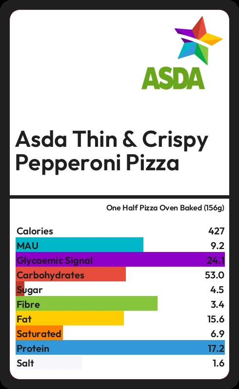Asda Thin & Crispy Pepperoni Pizza contains 427.4 calories in one Half Pizza Oven Baked (156g).