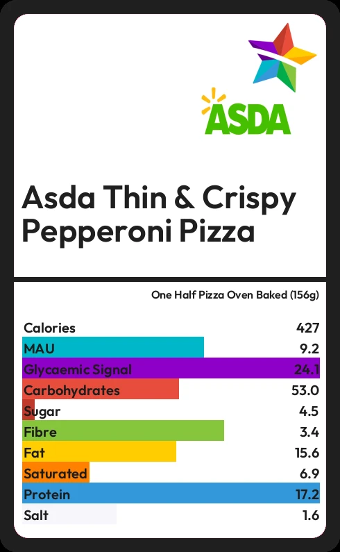 Asda Thin & Crispy Pepperoni Pizza contains 427.4 calories in one Half Pizza Oven Baked (156g).
