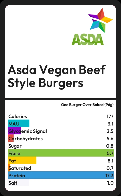 Asda Vegan Beef Style Burgers contains 176.6 calories in one Burger Over Baked (96g).
