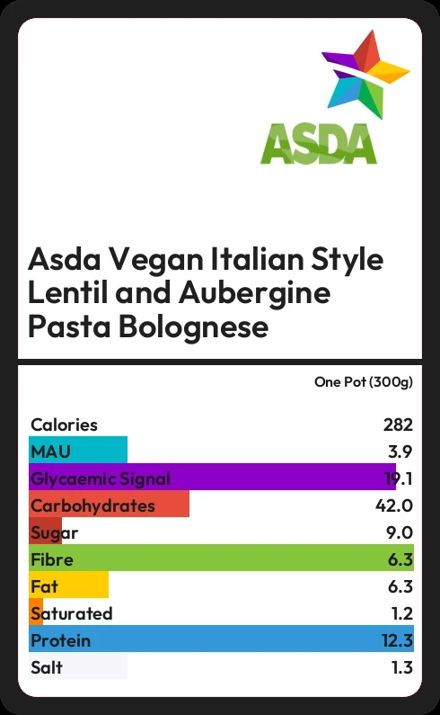 Asda Vegan Italian Style Lentil and Aubergine Pasta Bolognese contains 282 calories in one Pot (300g).