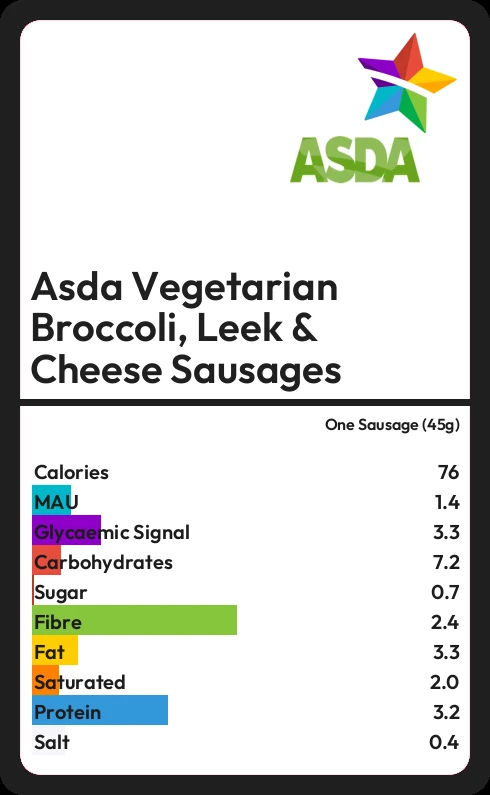 Asda Vegetarian Broccoli, Leek & Cheese Sausages contains 0.7g sugar in one Sausage (45g)