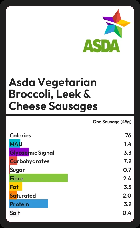 Asda Vegetarian Broccoli, Leek & Cheese Sausages contains 76.1 calories in one Sausage (45g).