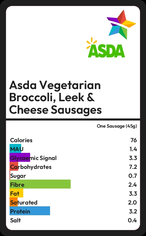 Asda Vegetarian Broccoli, Leek & Cheese Sausages contains 0.7g sugar in one Sausage (45g)