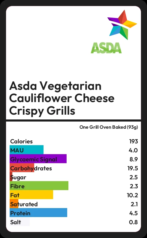 Asda Vegetarian Cauliflower Cheese Crispy Grills contains 193.4 calories in one Grill Oven Baked (93g).