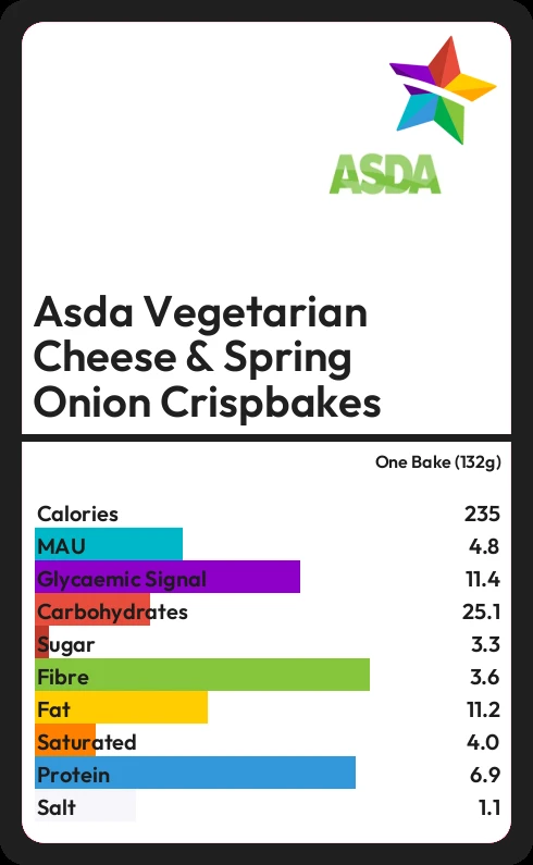 Asda Vegetarian Cheese & Spring Onion Crispbakes contains 235 calories in one Bake (132g).