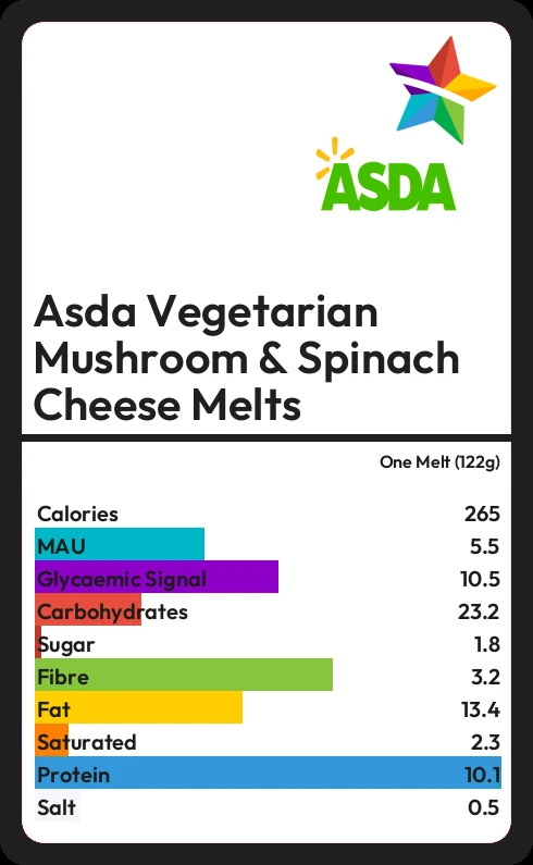 Asda Vegetarian Mushroom & Spinach Cheese Melts contains 1.8g sugar in one Melt (122g)