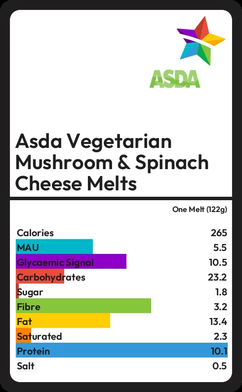 Asda Vegetarian Mushroom & Spinach Cheese Melts contains 1.8g sugar in one Melt (122g)