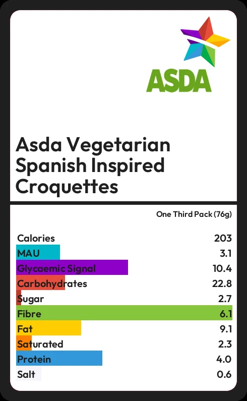 Asda Vegetarian Spanish Inspired Croquettes contains 202.9 calories in one Third Pack (76g).