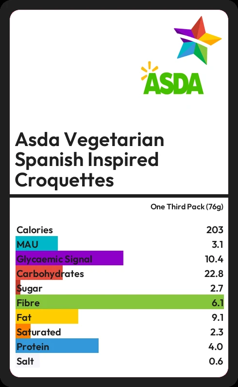Asda Vegetarian Spanish Inspired Croquettes contains 202.9 calories in one Third Pack (76g).