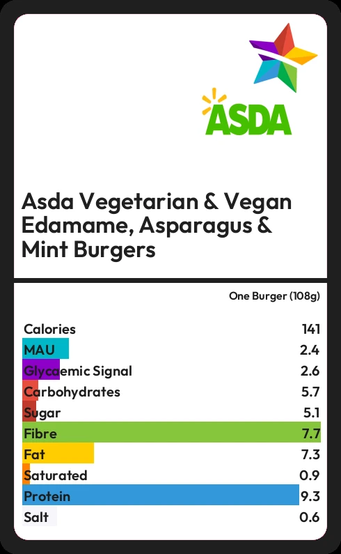 Asda Vegetarian & Vegan Edamame, Asparagus & Mint Burgers contains 141.5 calories in one Burger (108g).