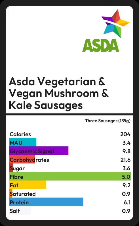 Asda Vegetarian & Vegan Mushroom & Kale Sausages contains 203.9 calories in three Sausages (135g).