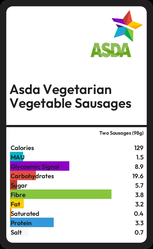 Asda Vegetarian Vegetable Sausages contains 129.4 calories in two Sausages (98g).